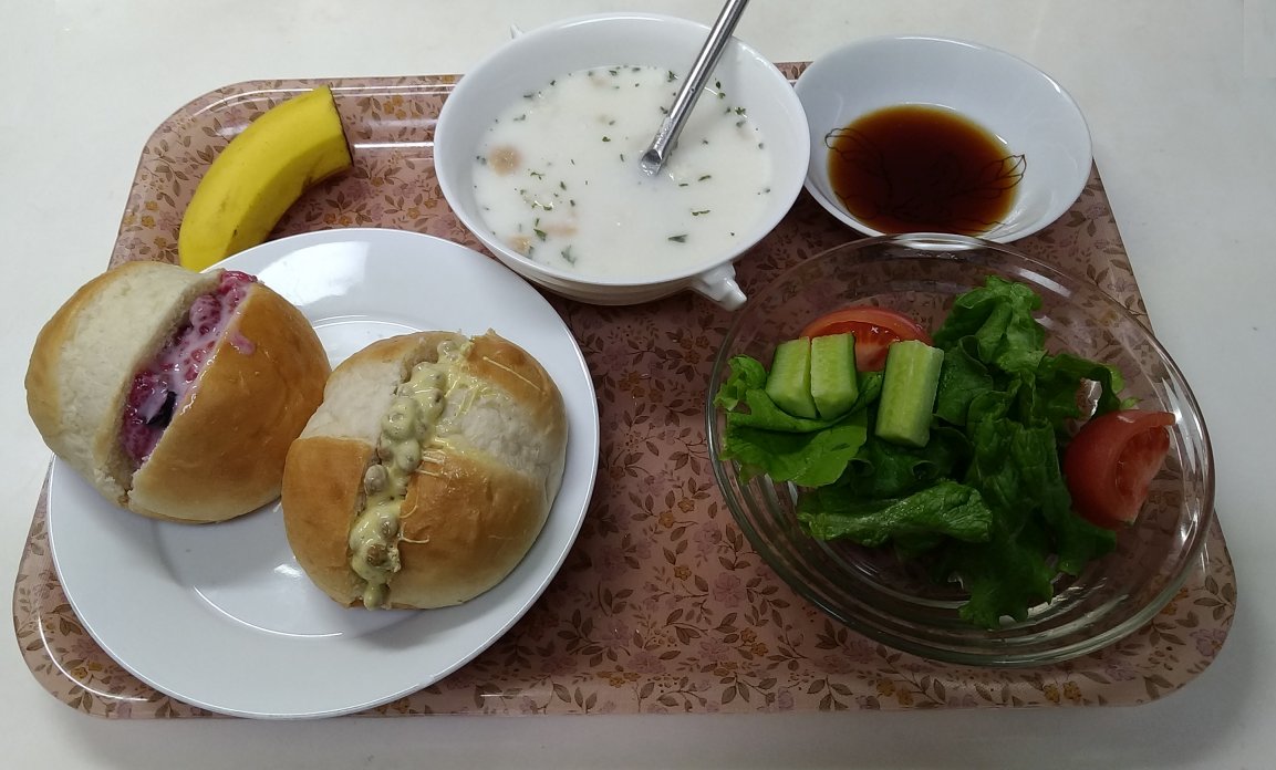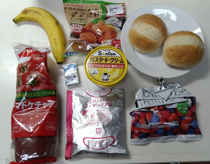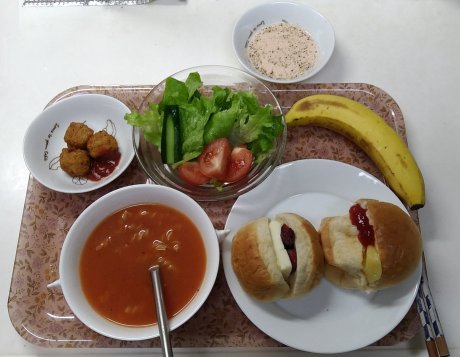 今日はバナナを1本,それと,大豆ミートの唐揚げを3つつけています.大豆ミートの唐揚げには トマトケチャップをつけて食べました.スープはトマトスープです.サラダのドレッシングは サザンアイランドドレッシング (お盆の上)です.