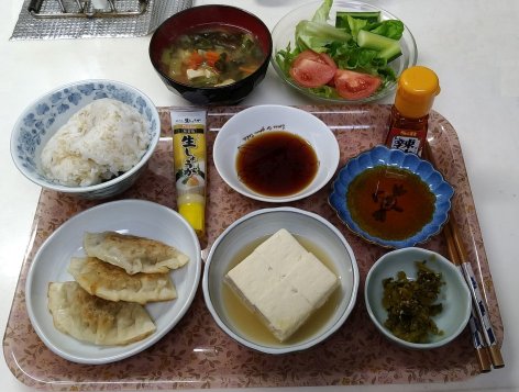 以前, ソイミートの餃子と湯豆腐の甘辛味噌かけ を作ったとき,湯豆腐があまりうまく行きませんでした.餃子は,そのとき作ったものが フリーズしてありますから,それを電子レンジで解凍して,再度,湯豆腐をつけて夕食に してみようと思いました.