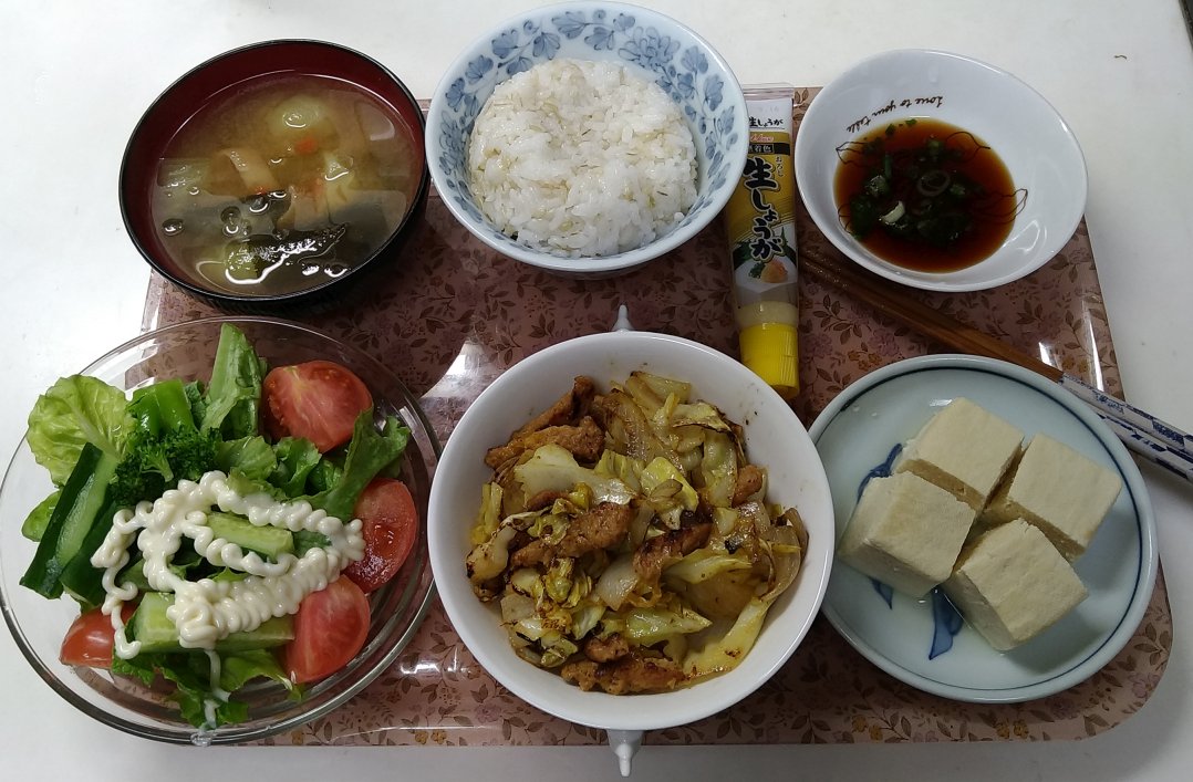 冷蔵庫に,使わないといけないキャベツが少し残っていたので,これまた,1/4 だけあった 玉ねぎといっしょにショウガ醤油で炒めてみました.あとちょっとリッチに大豆ミートと 最近買ってきたマスタードを使ってみました.下の画像は,見た目が若干残念な感じが あるかもしれませんが,結構おいしかったです.盛り付けも頑張らないといけないですね.