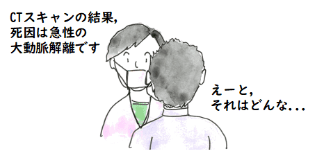 詳しい状況を書くと暗くなりすぎるので, 簡単に書くと,16:50 くらい,彼女が急に苦しみ出し,救急車を呼ぶように私に求めたのですが,5分後 救急車が来た時には心肺停止で,病院まで蘇生処置をしながら行くも,蘇生せず, 約40分後の 17:35 には死亡が診断されてしまったということです.その後,すぐ,CT スキャンで死因が 調べられ,急性の大動脈解離と診断されました.ん?,簡単に書くと言いながら, 結構,詳しく書いてしまったような気がします.