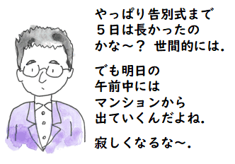そうしてとにかく,朋子さんの亡くなった次の日(4月15日(水))の夕方には,お通夜(4月18日(土))と 告別式(4月19日(日))の日取りが決まりました.それで喪主たる私は礼服があることを 確かめて安心していました.