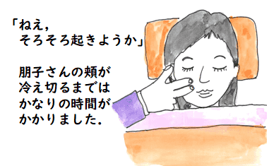 身体が冷えて,温度で彼女がすでに遺体であることを感じたのは夜の9時半くらいです.亡くなって 4時間後ですね.その夜は真夜中まで家内の顔をみて過ごし,2時位に床に 就いたのですが,さすがに一睡もできませんでした.欧米の人がエンバーミングを するというのも分かる気がします.でも,文化的な違いかもしれませんが, 私的にはきちんと彼女をこの世から送り出してあげないといけないと思います.