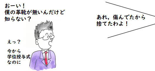 そう言えば,先日,朋子さんが「礼服のズボンが傷んでいるみたいよ」と 言ってたような気がします.どうも捨てられてしまったようです. 急いで息子と一緒に礼服を買いに行って事無きを得たのですが,確か, 昔もこんなことがあったと思います.やっと学位が取れて,学位授与式の 朝,背広を来て靴を履こうと思うと靴がないのです.朋子さんに聞いてみると,「あー, あれな,傷んでいたんで捨てたでー」とのこと.そのときも,急いで靴を 買い,なんとか間に合わせました.私は研究職だったので,あまり背広を着ることが なく,普段着ばかりだったので油断していたのです.