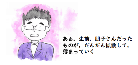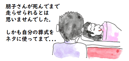朋子さんが生きていたころ,「あんた,身だしなみにはもう少し気を払いや」と よく言ってたことを思い出します.礼服を買って家に帰って,朋子さんの 遺体に一応文句を言っておきました.「亡くなってまで,あんたに走らせられるとは 思わなかったよ」と.
