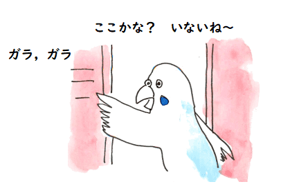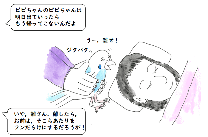 うちにはピピちゃんという5歳になる空色のセキセイインコが一羽います.私の 希望で,朋子さんと一緒に近くのホームセンターで買って来た子です.「ピピちゃん」という 名前は朋子さんの命名です. 小さいときは私にも懐いていたのですが,水浴びを無理にさせたり,少しスパルタが 過ぎたのか,私からは逃げるようになって,朋子さんに懐いています.どこか 隅に潜っているとき,私が手を入れるとかみつくくせに,朋子さんが手を入れると 「げぇげぇ」と甘えた声を出して,手にまとわりつくのです.朋子さんが京都とかに何日か遠出するときなんかは 世話は大変です.ピピちゃんをなんとか,なだめ,すかししながらカゴに入れて 寝せないといけないのです.朋子さんが帰ってきてくれると,私もピピちゃんもホッと します.