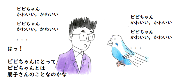 それで分かったことが一つあります.うちのピピちゃんはメスなので, 覚えた言葉は,「ピピちゃん,かわいい,かわいい」だけでした.朋子さんが 亡くなってから,ピピちゃんが,しきりに「ピピちゃん,かわいい,かわいい」と 言うのです.私が復唱すると,またピピちゃんが復唱して,また,私が復唱してと 言った具合にずっと続く訳です.そのとき気が付いたことと言うのは,ピピちゃんにとって 「ピピちゃん」とは自分のことじゃなくて,朋子さんのことだったのです. 朋子さんが「ピピちゃん,かわいい,かわいい」と言っていたので,きっと, 朋子さんを「ピピちゃん,かわいい,かわいい」と思い込んでいるのです. つまり,これは朋子さんを呼んでいるのだと思います.
