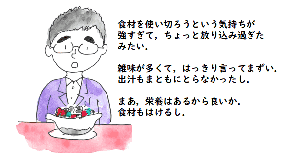 しかし,配達された量をみて びっくり.やっと,冷蔵庫に押し込んで,「これをどうやって腐らせずに食べようか」と 思案に暮れました.「いや,朋子さんは礼服のことといい,やってくれるな」と思ったりします. せっかく,生協の人が「止めますか」と言ってくれているのに,注文を確認もせずに 配達させた方が悪いのですけど.
