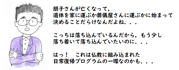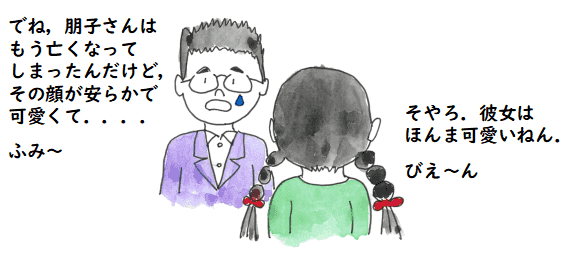 その日,色々な理由から,結局,彼女の遺体を自宅に連れて帰りました.自宅から 二時間くらいのところに住んでいる長男を呼び,色々助けてもらいながら,お葬式の 準備をしました.息子も結構しんどかったんじゃないかと思います.ずっとこちらに いたわけじゃなく,お葬式が終わるまで,二時間くらいの距離を3往復させちゃいましたから.