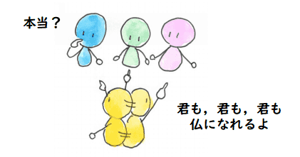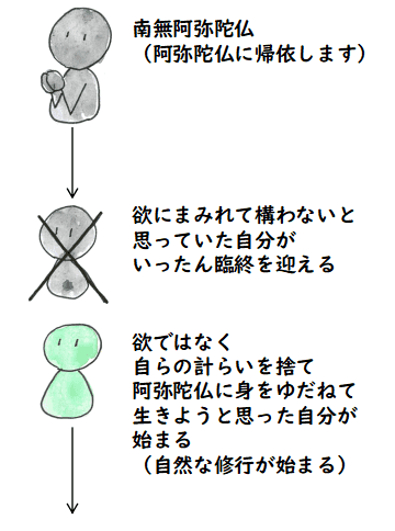 これに対して浄土教に基づく宗派では儲けさせるという導き方はありません. ただただ,阿弥陀仏の御名を唱えて,身をそこに投げ出させるのです.もっとも,極楽往生で 釣っているのかもしれませんから,ある意味ではこれも「欲」を使った導き方かもしれません.