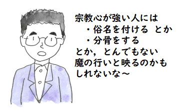 葬儀屋さんとの打ち合わせでは,戒名を付けないのは慎重に考えた方が良いと言われました. この後,ご主人やお子さん,そのお子さんが入るお墓で一人だけ俗名だと変ですよとか, ご主人も亡くなったとき,戒名付けられなくなりますよとか.