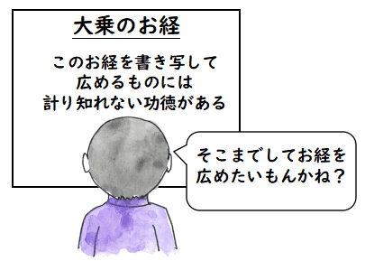 最近は芸能人とか仏教の素人が勝手に自分勝手な理屈をつけて仏教を解説した本がたくさん出ている. そういうのに限ってお経を実際には唱えない.仏教は実践だ. そういう理屈だけ考えているのではなく,お経の一節でも唱えるほうがよっぽど 効果がある.まずは,般若心経の一節だけでも良いので声に出して読んでみるべきだ宗教嫌いな人は,「また,お坊さんは,迷信みたいなことを言って人を惑わしている」と思われるかも しれませんが,私は,これは頭の中のゴミ整理に効果があると思います.布施(ふせ), 持戒(じかい),忍辱(にんにく)なども実践でしょうが,お経を唱えることも 実は重要な実践だと思います.