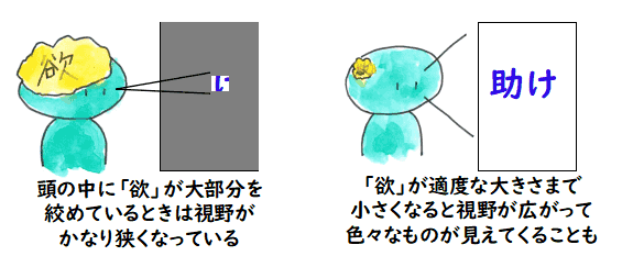「欲」に囚われているときは,こういう一部分を無意識的に見落とした判断をしがちです. 差し出されている手が助けだと分かるためには,目を覆っている「欲」の鱗を取らなければ なりません.それには,ただただお題目を唱えたり,念仏を唱えたり,座禅をしてみたり, お経をあげてみたり,写経をしてみたりということが効果があります.そのお商売をされている 方も夜中までお題目をあげられて,鱗の取れた状態でお金を貸している方と会われたのでは ないでしょうか.