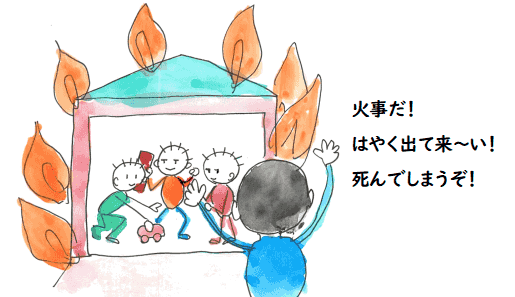 ところが,その家が火事になり,長者は逃げ出したのですが, 子供たちは遊びに熱中していて出てきません.長者が子供たちに 「この家は火事なのですぐ出てこないと死んでしまう」と言っても, おもちゃに熱中している子供たちは出てこようとしません.