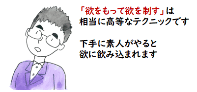 そこはウソを言って一旦,博打の場から離れさせて,少し冷めさせないと A氏は聞く耳を持たない.ちょっと冷めたたところで, より価値のある仏の教えを与えれば,それは結局はウソを言っていることにはならない. 宝のような法華経の教えを受け取ることができるのだから.ということだと思います.「欲」を制するのに「欲」を使って良いかということで,法華経の 比喩品では「良い」と言っているのでは無いでしょうか.でも,儲かると言っておいて,結局,題目を唱えさせられる「幸せ」を与えられるだけなので,それに気づいた人は怒るかもしれません. 「欲」を使って「欲」を制するのは高等テクニックなのです.法華経をよりどころにする お坊さんは相手の状態に相当気を使いながら導いていかねばなりません.