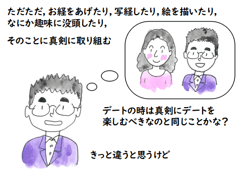まあ,理屈は放っておいて,時々,そういう一見無意味とも思える 行為に没頭することは良いことだと思います.ただし,素人が自分の「欲」を制御しようと すると,その行為自身が「欲」に振り回されている行為な訳ですから,ひどい目にあうのがおちです. そういう小賢しいことを考えずに,本当に,ただただ,お経をあげたり,写経したり,絵を描いたり, なにか趣味に没頭したりして,そういう没頭する時間を持てたことに感謝するのが 良いのでしょうね.