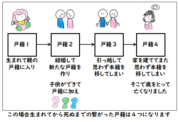 この繋がっている戸籍は,逆順に追っていくのですが,場合によっては沢山に なることがあります. 例えば,引っ越すたびに本籍を変えている人は,集めるべき戸籍がとてもたくさんあり, 各地の役所に郵送で請求しないといけないので,集めるだけで苦労します.現在,戸籍謄本を 1つとるのに手数料が 750円ですから,上の図のように4つ取ると 3,000 円です.往復の切手代や 支払いのための定額少為替の手数料をいれると 4,000 円を超えます.