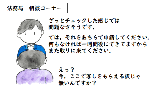 受け取り方として,「窓口で写しを受け取る」と書いていくと, 登録された後,もう一度行かないと 行けません(私はそうしました).面倒な人は郵送にしてもらうと良いです.しかし,それには宛先を書いて切手を貼った 封筒をつけないといけないとのこと.申請のときに付けた戸籍の束も送り返してくるので, それに応じた大きさの封筒と料金不足にならない切手を貼る必要があります.