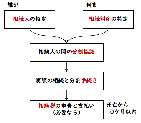 遺族向けのパンフレットなどに書いてあると思いますが,いくつかの重要な期限を 認識しておくのも必要です(相続放棄は3カ月以内,準確定申告は4カ月以内, 相続税の申告・支払いは10カ月以内など).