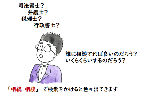 また,頼む支援内容によってはもう少し安く頼めるところも あるかもしれません.相場がよく分からないので,いったい,いくらで何をやって もらえるのか分からないというのも遺族にしてみれば悩みの種ですね. 兼好法師ではありませんが,「よき友」の中には相続など法律や制度の知識の ある友も入れても良いのかもしれません.私は相談する伝手が無かったですが, インターネットで検索してみると,相続関係の相談や手続きを支援して くれる職種としては,司法書士,弁護士,税理士,行政書士などの職種が上がって きます.例えば,「遺産分割協議書作成」だけとか相続の中の1つの手続きだけなら 5万円程度だとかいうページも見たことがあります.ご参考までに.