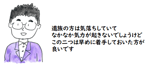 配偶者を亡くしてしまったばかりの人は落ち込んでいて,「相続」のことを 考える気力が起きないかもしれませんが,後々のことを考えて,早めに 着手しておくべきことがあります.次の2つを読んでおくと良いと思います.