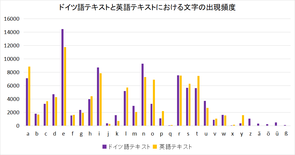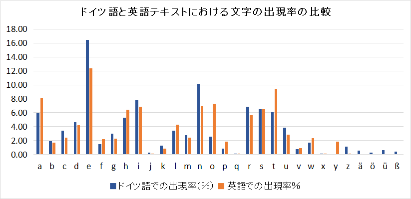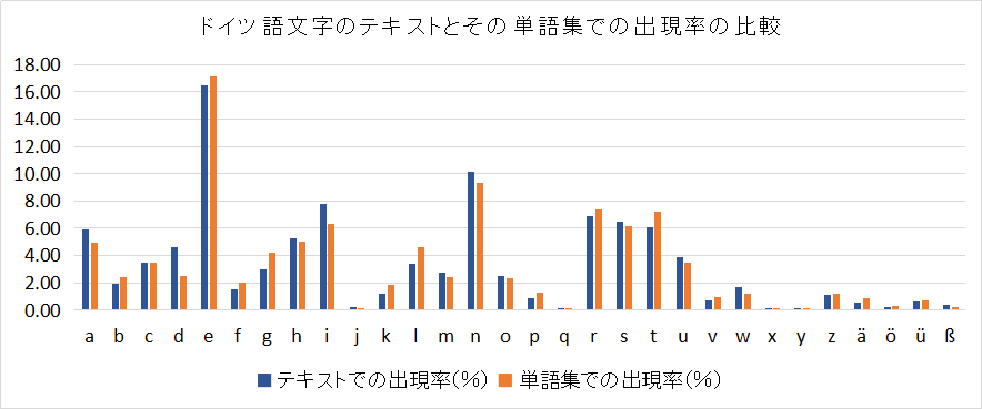 ドイツ語も,テキストの中に現れる文字の出現率と,それを単語集にしたときの文字の主具現率は異なるかもしれない.