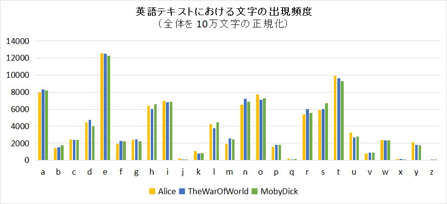 具体的な文字数,単語数などは省略するが,このようにして調べた文字の出現比率の グラフを次に示す.