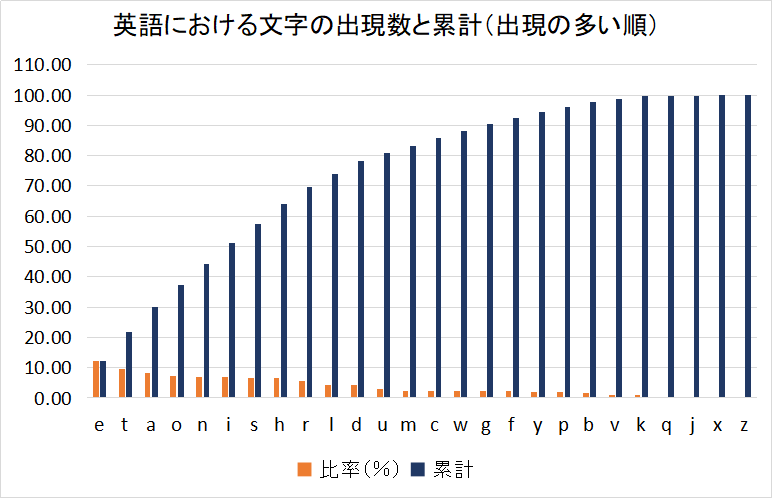 e i n r t s a o l d c u g p h m y f w b k v x q j zテキスト内の出現頻度では次の通りだった.