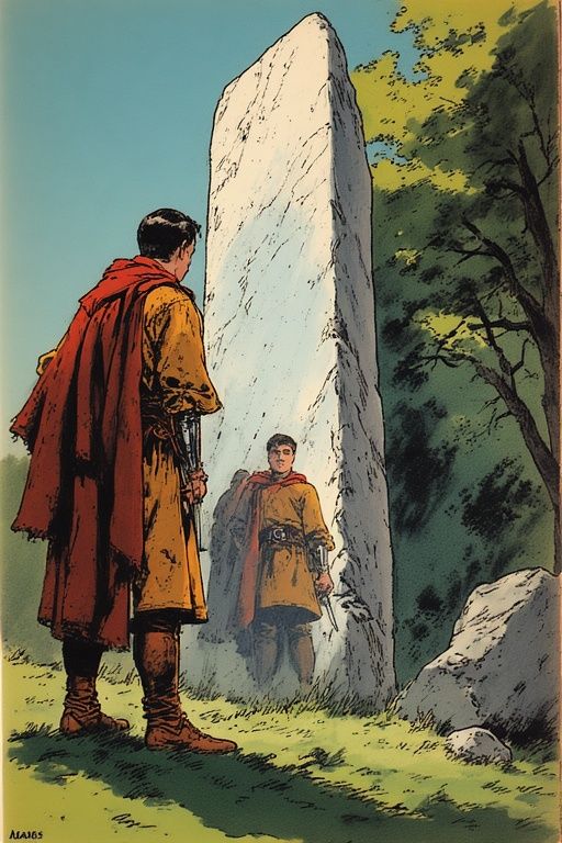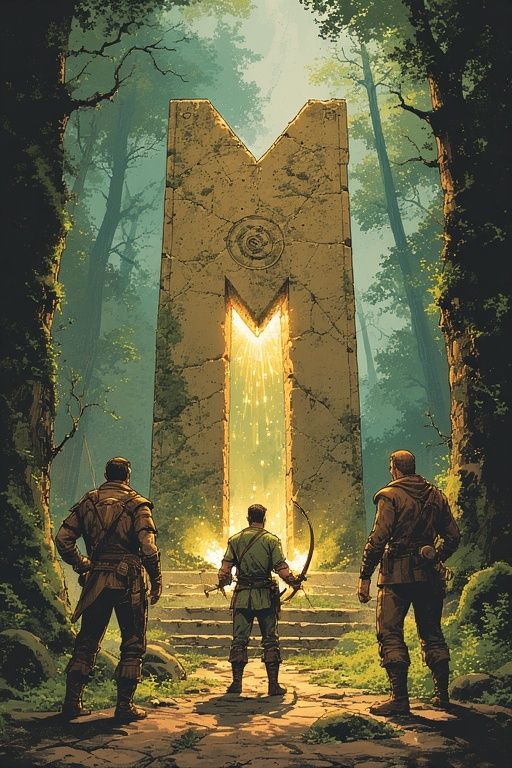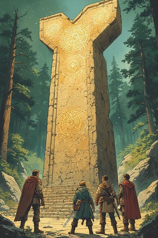 情景: 深く神秘的な森。苔むした古代遺跡の前に、3人の冒険者が立っている。一人は賢者風のローブをまとい、もう一人は剣士、そしてもう一人は弓使いだ。彼らの前に、不思議な光を放つY字型の巨大な石碑 がある。![]()