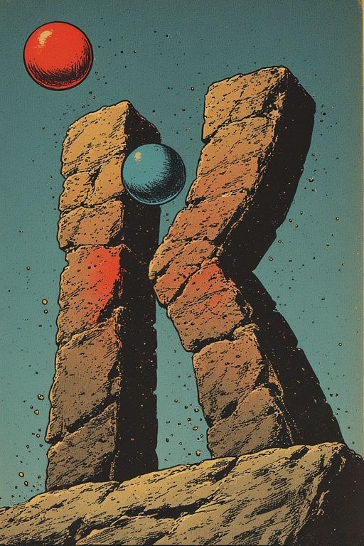 画像生成の指示(Kコンビネータ): K字型の石碑が、二つの異なる色(例えば赤と青)の光の玉を受け取り、一方(赤い玉)だけを選んで放出し、もう一方(青い玉)は消滅させる様子。